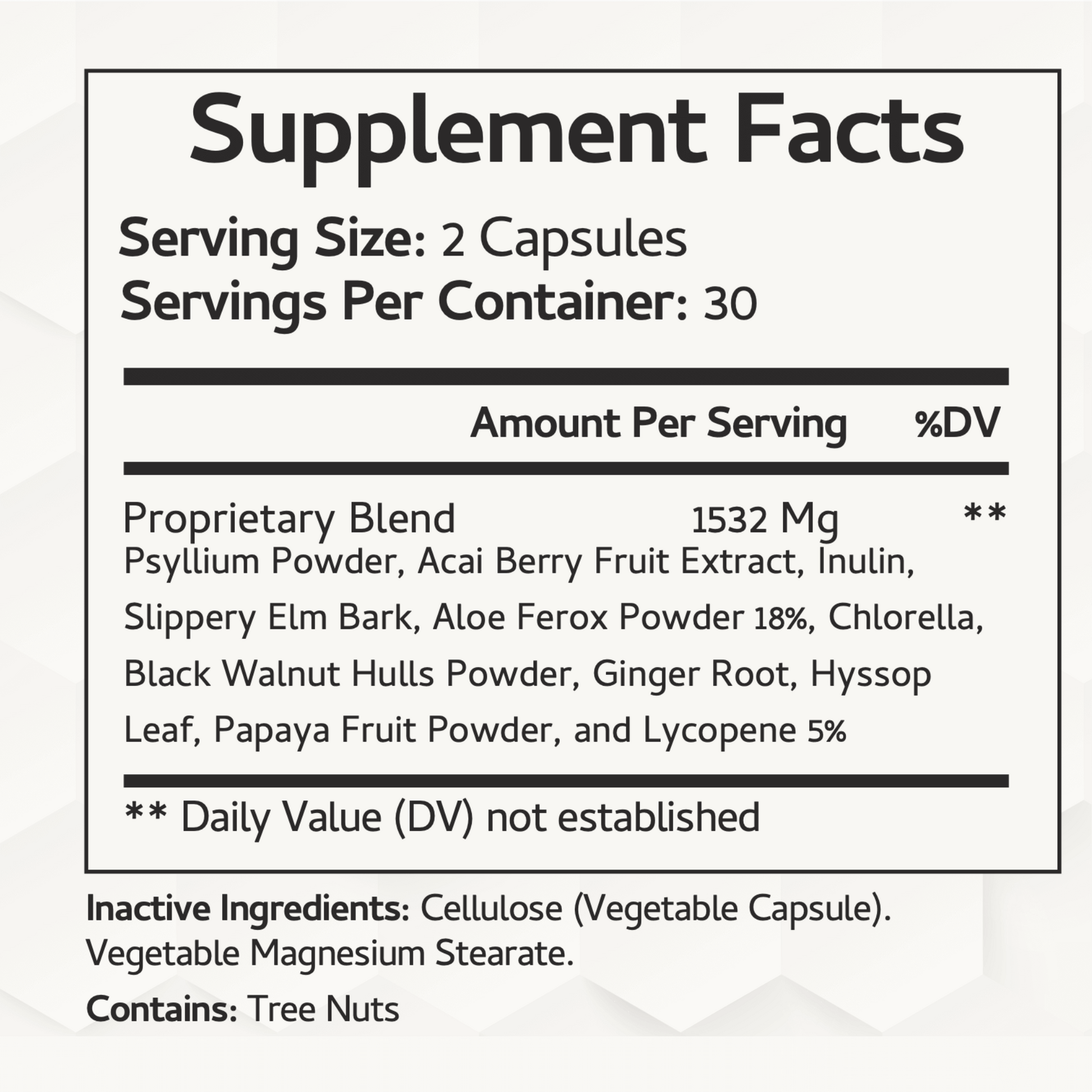 Key Ingredients: Psyllium Husk Powder, Slippery Elm Bark Powder, Aloe Ferox Powder, Chlorella Powder, Ginger Root, Black Walnut Hulls, Papaya Fruit Powder, Hyssop Herb Powder, Acai Berry Extract, Lycopene, Inulin