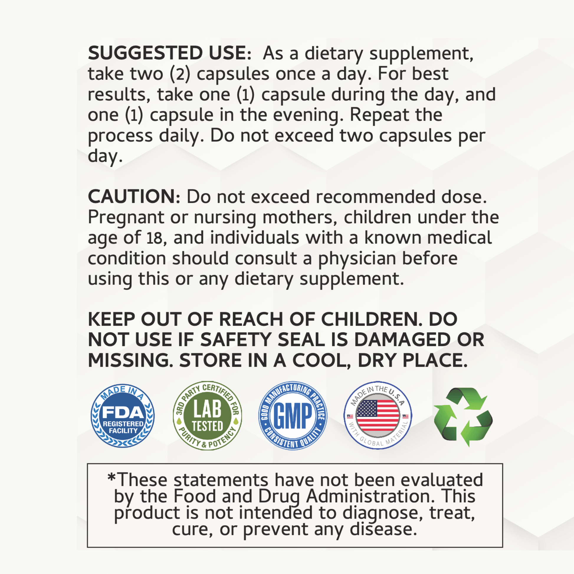 | Suggested Use: As a dietary supplement, take two (2) veggie capsules once a day. For best results, take one (1) veggie capsule during the day, and one (1) veggie capsule in the evening. Repeat the process daily. Do not exceed two capsules per day. |