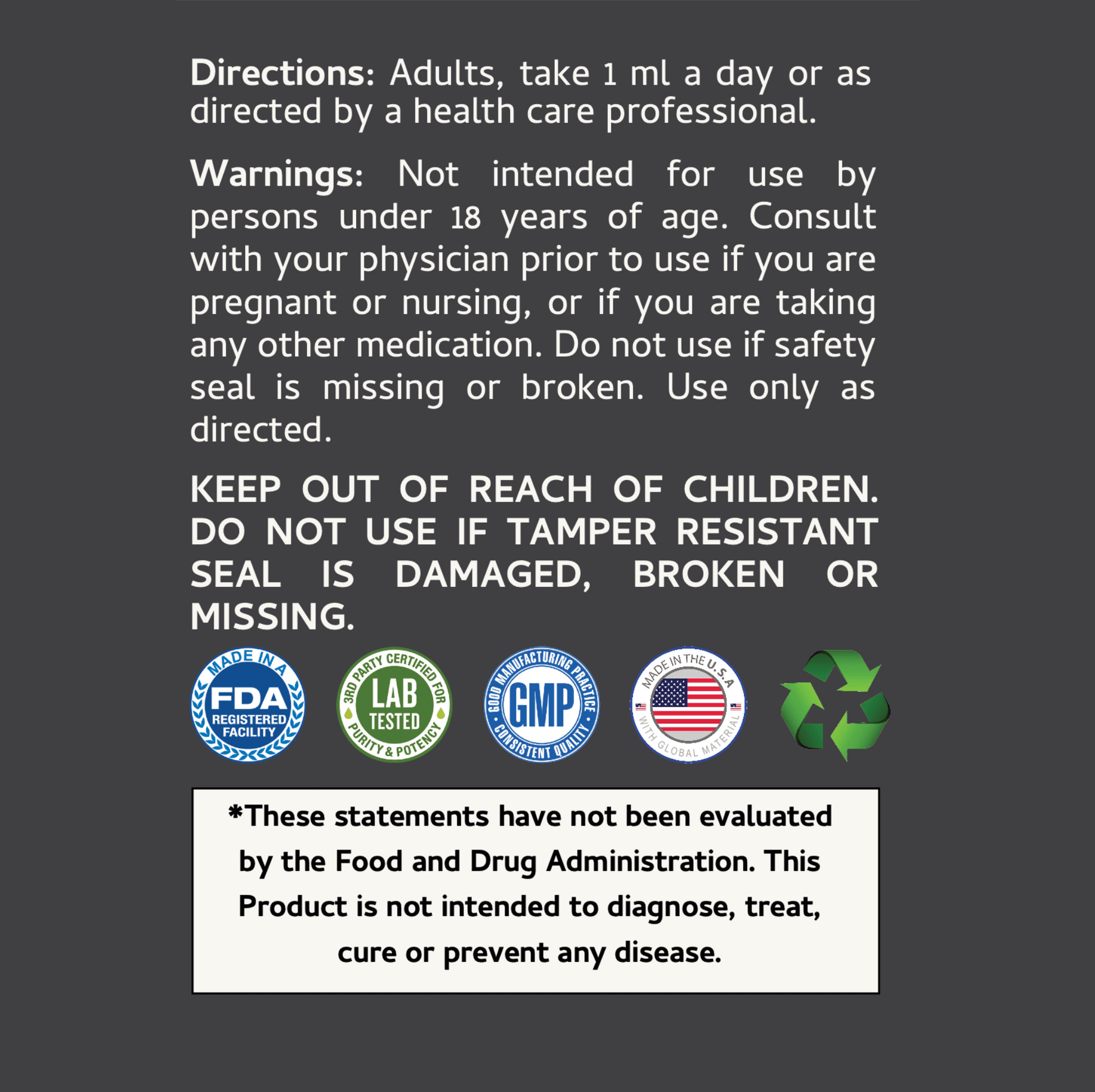 | Adults take 10 drops, 3 times per day, or as directed by a health care professional. Place drops under the tongue. Hold drops under the tongue for 15 seconds before swallowing. For children under 12 years of age, consult a physician before use. |